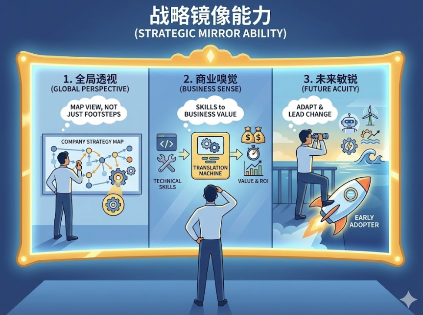 很多人在职场上卡住,不是因为执行力差,而是因为只会低头看脚下,却不会抬头看全局。所谓战略镜像能力,就是给你装上一面“大镜子”,让你能在更大的画布上理解自己的位置。它包含三个层次。