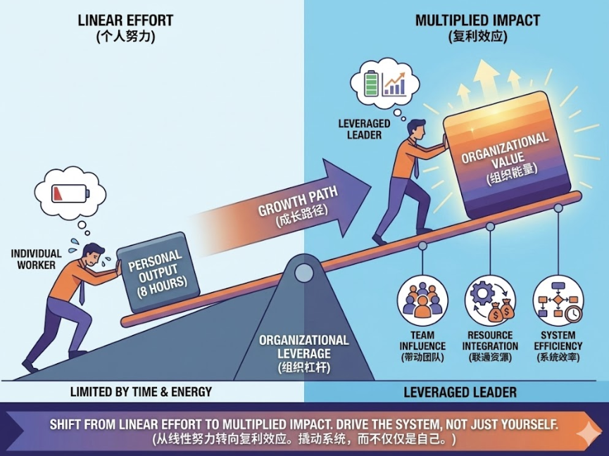 一个人再厉害,一天也只有 8 小时。但如果你能影响别人、带动团队、联通资源,你的价值就能被成倍放大。这就是杠杆:把个人能量转化成组织能量。真正让一个人脱离执行层,进入影响层的,不是“看得见”,而是“撬得动”。
