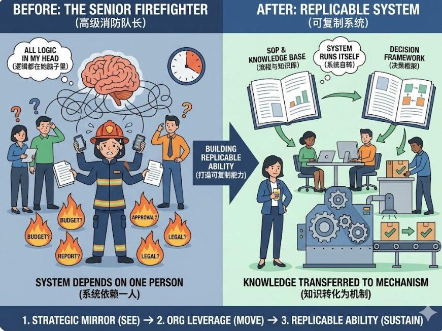 她从一个“系统的杠杆”,又悄悄退回成了“高级消防队长”。这就是本节要讲的第三个关键能力:可复制能力。